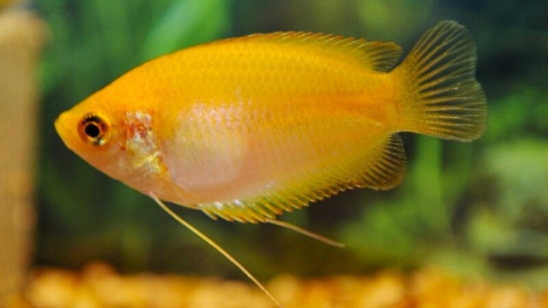 Einer der kleinsten Labyrinthfische, die goldene Nachzucht des Colisa chuna (Honiggurami).